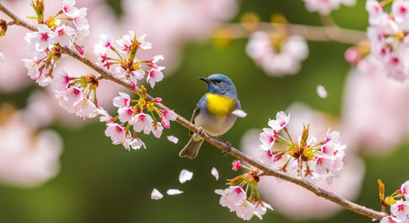 Vibrant Blue Bird Perched on Cherry Blossom Branch Spring