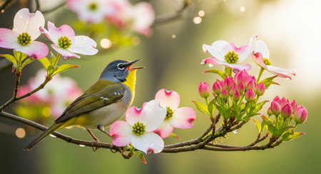 Colorful bird perched on flowering branch in serene garden at golden hour, showcasing natures beauty and tranquility