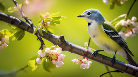Northern Parula bird perched amidst pink cherry blossoms branches