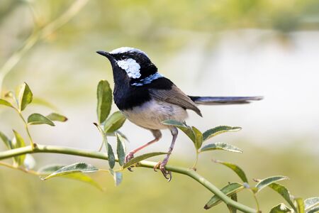 A blue faced male Superb Fairy-Wren sitting on a green branch