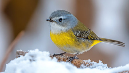 A small, colorful bird with a bright yellow beak is perched gracefully on a snowy white branch in winter