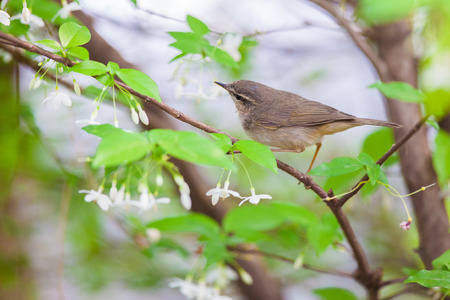 Warbler small on yellow flower branch in garden outdoor