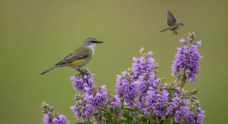 Willow Warbler (Phylloscopus collybita) on a purple flower