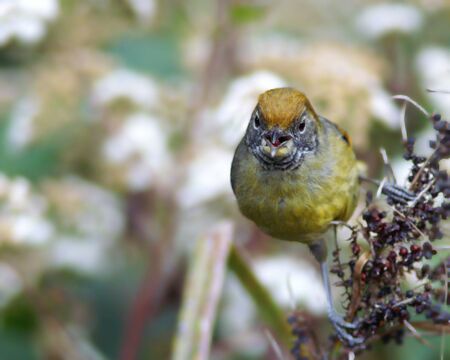The bird with distinctive yellowish supercillium and rufous crown.