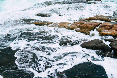 Blue bubbling water of mountain river. Ocean tide of turquoise sea