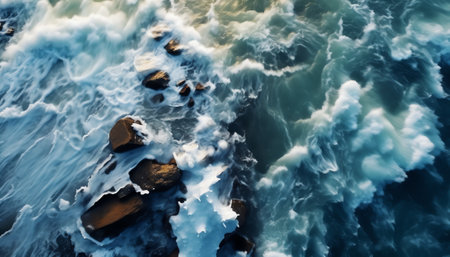 Top down shot of splashing white waves in the ocean. Generative AI