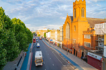 London, England - August 7 2017; Sunsets at far end Mile End Road with vehicles moving along the street, people and red brick landmark Guardian Angel Catholic Church catching last rays of sun, Bow London