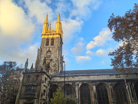 Gothic towers of St Sepulchre-without-Newgate church bathed in golden hour sunlight in London