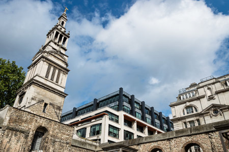 LONDON, UK - AUGUST 21, 2015: Christchurch Greyfriars Church Garden contrasting with moder buildings in London