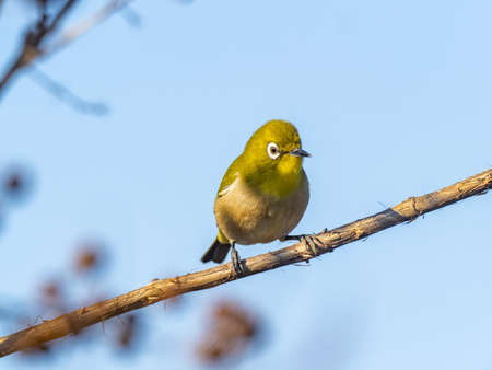 cute small Japanese white-eye, zosterops japonicus, perches in a tree on a bright sunny day in Kanagawa, Japan.