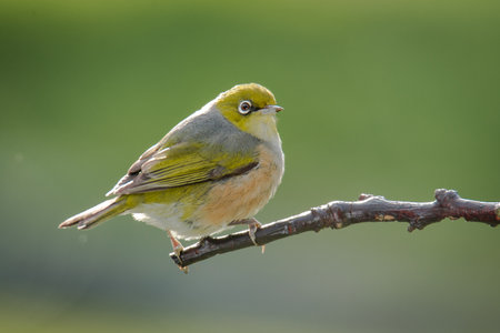 Silvereye or wax eye perched on branch isolated against out of focus background
