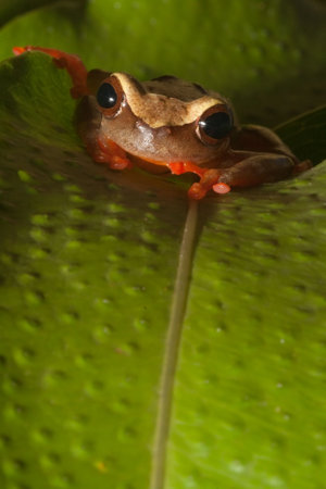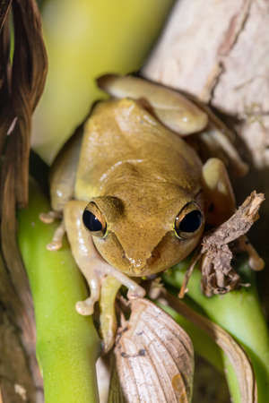 File-eared tree frog or bony-headed flying frog (Polypedates otilophus) hiding on a leaf.