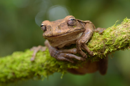 Brown frog sitting on a branch in the rainforest of Costa Rica