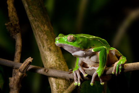 green frog on branch of tropical rain forest. Amazon amphibian sitting in jungle.