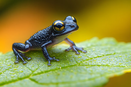 Vibrant golden yellow frog. Large black eyes. Dark gray surface. Blue background. Amphibian close up. Wildlife photography. Exotic creature. Detailed skin texture. Bright colors. Tropical animal. Serene portrait of a beautiful animal.