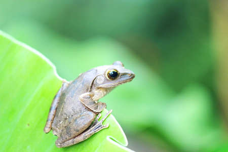 Polypedates, Sleeping on a green banana leaf.Green light reflected (focus eye close-up)