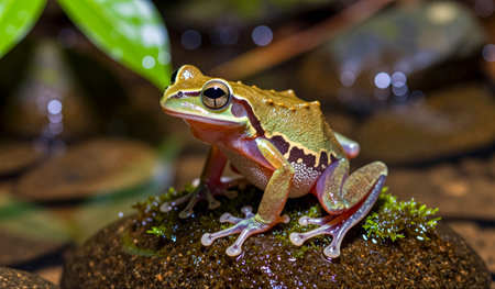 A vibrant frog sits on a moss-covered stone by a tranquil water stream, surrounded by greenery and gentle reflections. The scene captures nature's beauty and peacefulness in a forest.