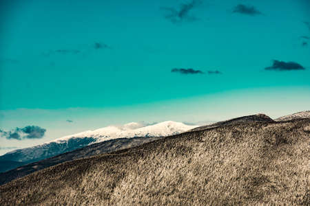 Beautiful winter sunny day on snowy mountains. Snow covered landscape in mountains. Snow trail on mountains.