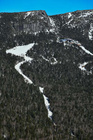 View to Cliff House Restaurant at top of Mt. Mansfield Vermont at Stowe ski resort. Late spring time with snow on the mountains and blue sky.