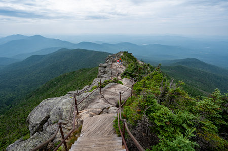 Whiteface Mountain summit trail in Adirondack Mountains of New York State on sunny overcast summer day.