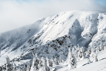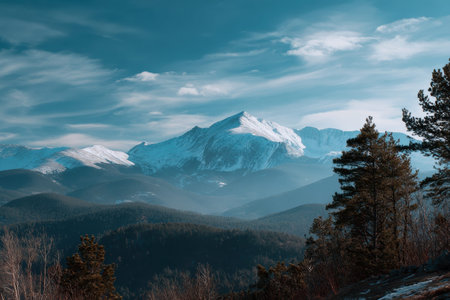 Beautiful winter landscape with snow covered mountain peaks and coniferous forest