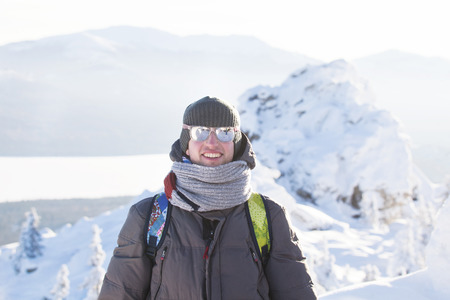 Man in warm jacket and hat against ski resort background with copyspace. High quality photo