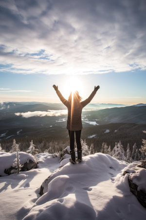 A woman standing on a mountaintop, arms outstretched and face turned towards the sun.