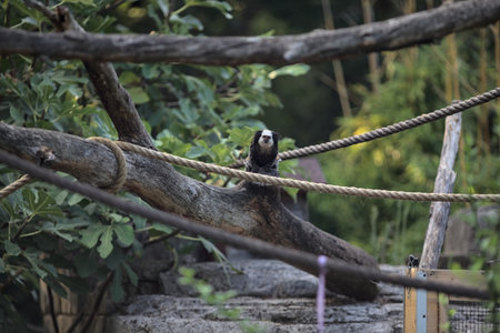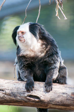 Monkeys black-tufted marmoset or titi de penachos negros sitting on branch tree in zoo
