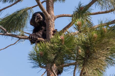 A small baby black bear high up a pine tree holding on with sharp claws and looking in the distance with a clear blue sky background.