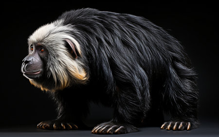 marmoset displays its fluffy ears and curious expression. The small primate stands on a dark surface highlighting its unique features in a close up view. Its lively eyes invite admiration.
