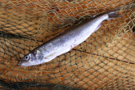 Smelt fishes on net. Pacific smelt fish variety