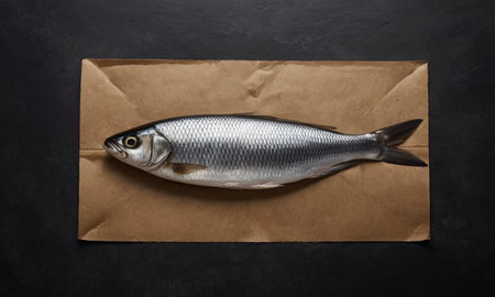 Fresh herring fish on craft paper over black background. Top view