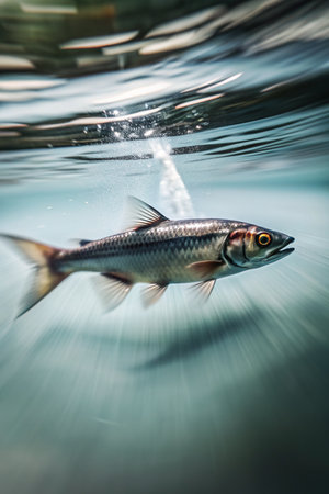 Single silver fish suspended on fishing hook against deep blue-black background. for fishing, seafood, food industry, marine life, and environmental conservation concepts.