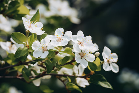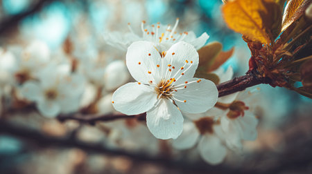 Delicate white cherry blossoms blooming on a branch in springtime