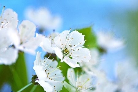 Macro shot of white cherry flowers isolated on blur background.