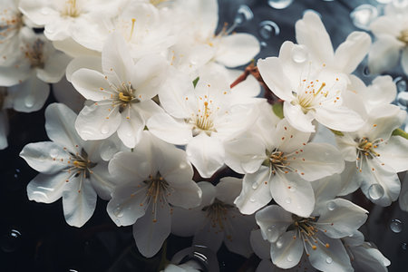 A close-up image of beautiful, white flowers, likely cherry blossoms, with water droplets clinging to the petals.