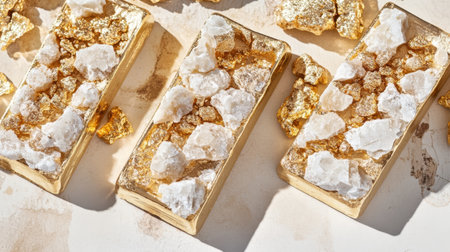 This stunning image showcases luxurious gold bars adorned with white crystals and gold flakes, ideal for themes of wealth and opulence.