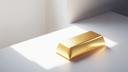 A stunning gold bar rests on a clean surface, illuminated by soft natural light, casting gentle shadows. This minimalist image evokes themes of luxury and wealth.