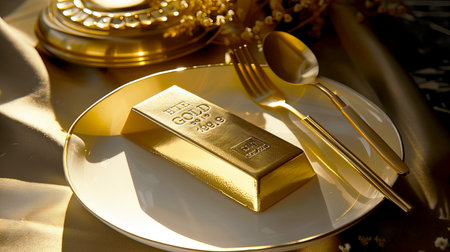 A luxurious table setting featuring a gold bar on a white plate, accompanied by gleaming golden cutlery. This elegant arrangement creates an opulent atmosphere.