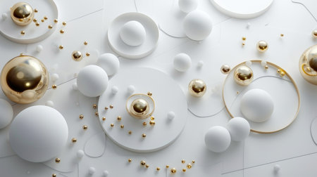 This captivating arrangement features a harmonious blend of white and gold spheres set against a light backdrop, ideal for modern design themes.