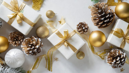 A stunning collection of golden Christmas decorations and gifts arranged beautifully on a white background, evoking the spirit of the festive season with elegance.