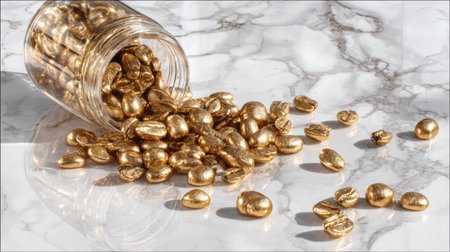 A stunning scene featuring golden coffee beans spilling from a glass jar onto a sleek marble surface, blending luxury with gourmet coffee culture for an eye-catching display.