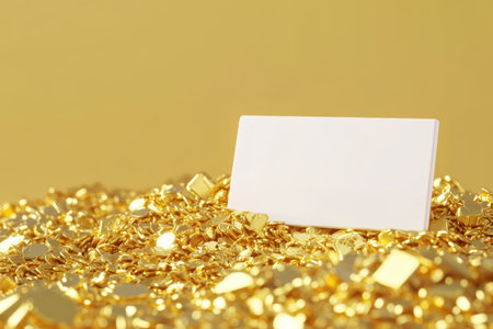 A white box is placed on top of a pile of gold. The gold is scattered all over the box, creating a sense of abundance and luxury. The scene evokes a feeling of wealth and opulence