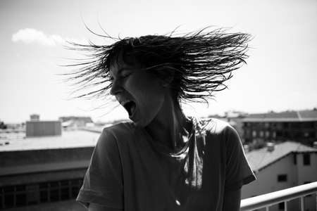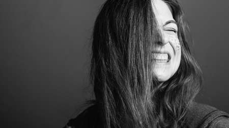 Woman grimacing. Rage facial expression. Bared teeth. Black and white portrait. Copy space.