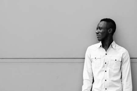 Profile view of young black African man thinking while looking at distance against orange painted wall