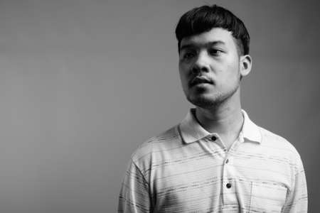 Portrait of handsome man on grey background, space for text. Black and white effect