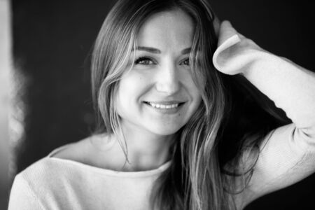 Portrait of a beautiful young woman smiling on the beach. Black and white photo.