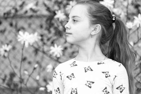Little girl on floral blossom in spring. Child with blossoming flowers outdoor. Beauty kid with fresh look and long hair. Spring, easter and holidays celebration concept