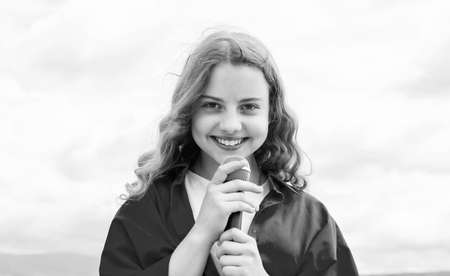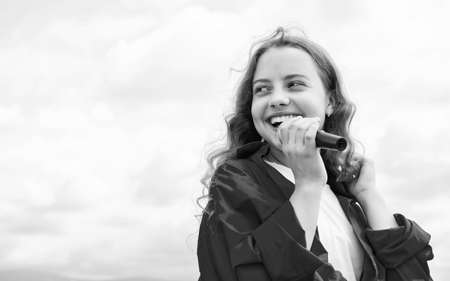 vocal school concept. karaoke club. music is my life. kid sing with mic. cheerful event manager. child have fun on party. happy singer with mic. classic cool. girl singing. Everything must be perfect