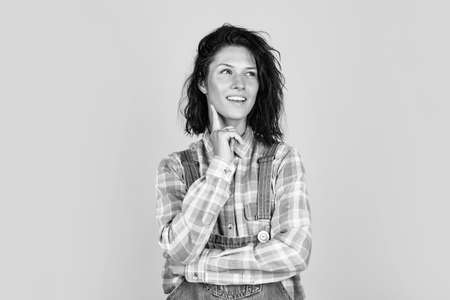Pretty joyfully female model looking with satisfaction. Studio portrait of looking beautiful woman isolated against yellow background.